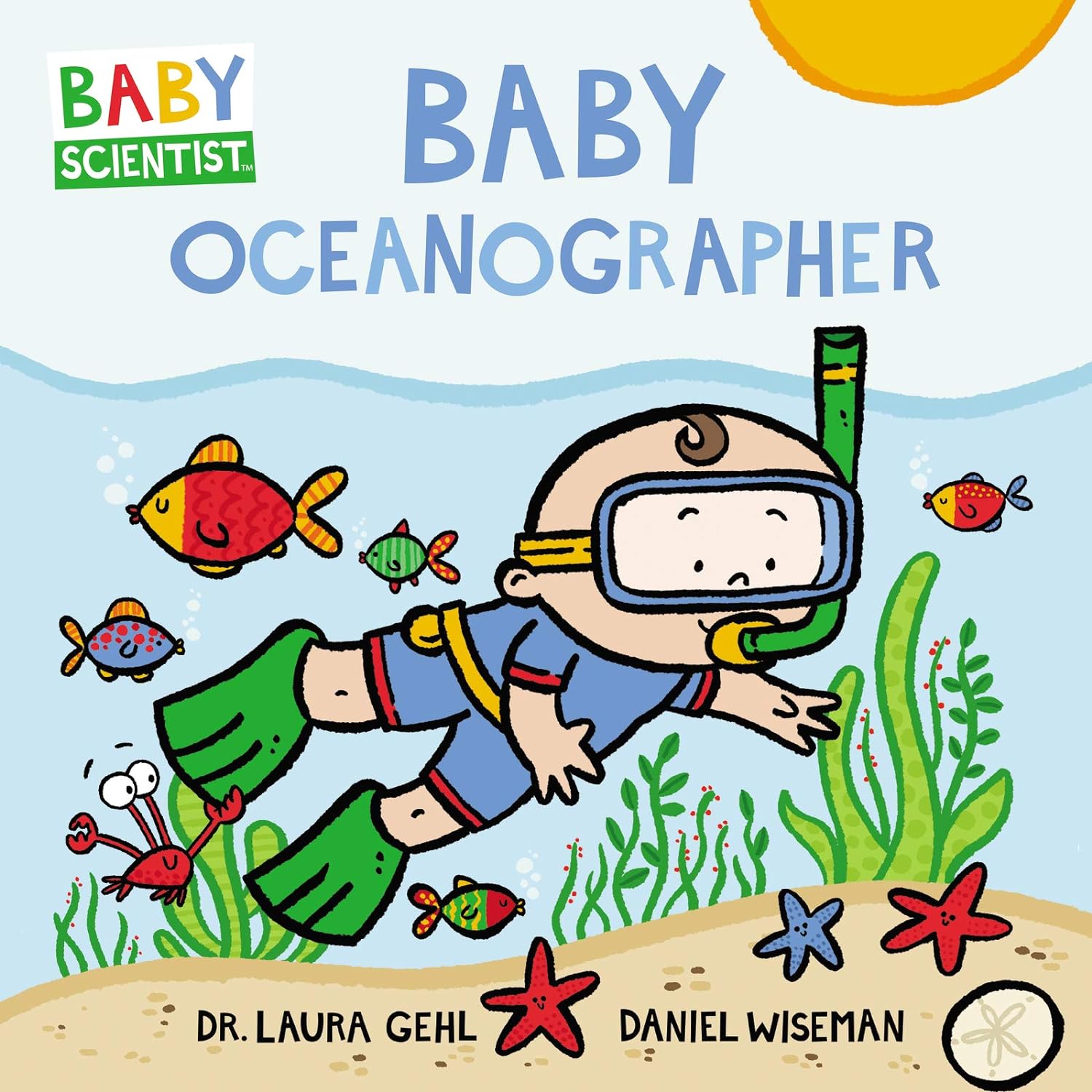 Baby Oceanographer explores the oceans. With his snorkel and mask, he looks at the animals and plants under the sea.