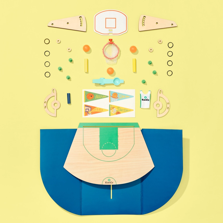 Complete set includes: 8-piece wood catapult, mini jersey, 7 screws, 8 rubber bands, 3 tubes, stick, lever, court, back wall, backboard, flag stickers, basket, sticky foam, 3 balls, and illustrated instructions