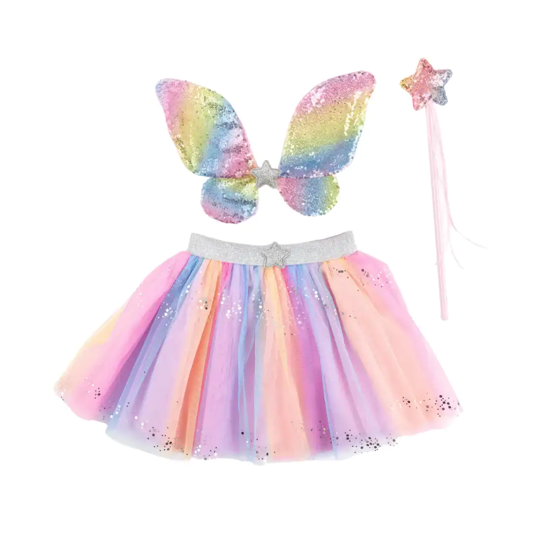 Enjoy all the sparkly fun without any shedding glitter! Rainbow Sequins Skirt is made with a wider elasticized waistband which allows for greater comfort and size flexibility. The multi-coloured rainbow skirt is layered and the top mesh layer features holographic heat-sealed sequins for that extra sparkly effect and no glitter shedding! This set includes a sequin-covered star wand with hot sealed flowing ribbons and wings that are covered in rainbow sequins & lined with beautiful pink satin. This is a great fun design, the skirt is machine washable, and it’s a truly beautiful ensemble!