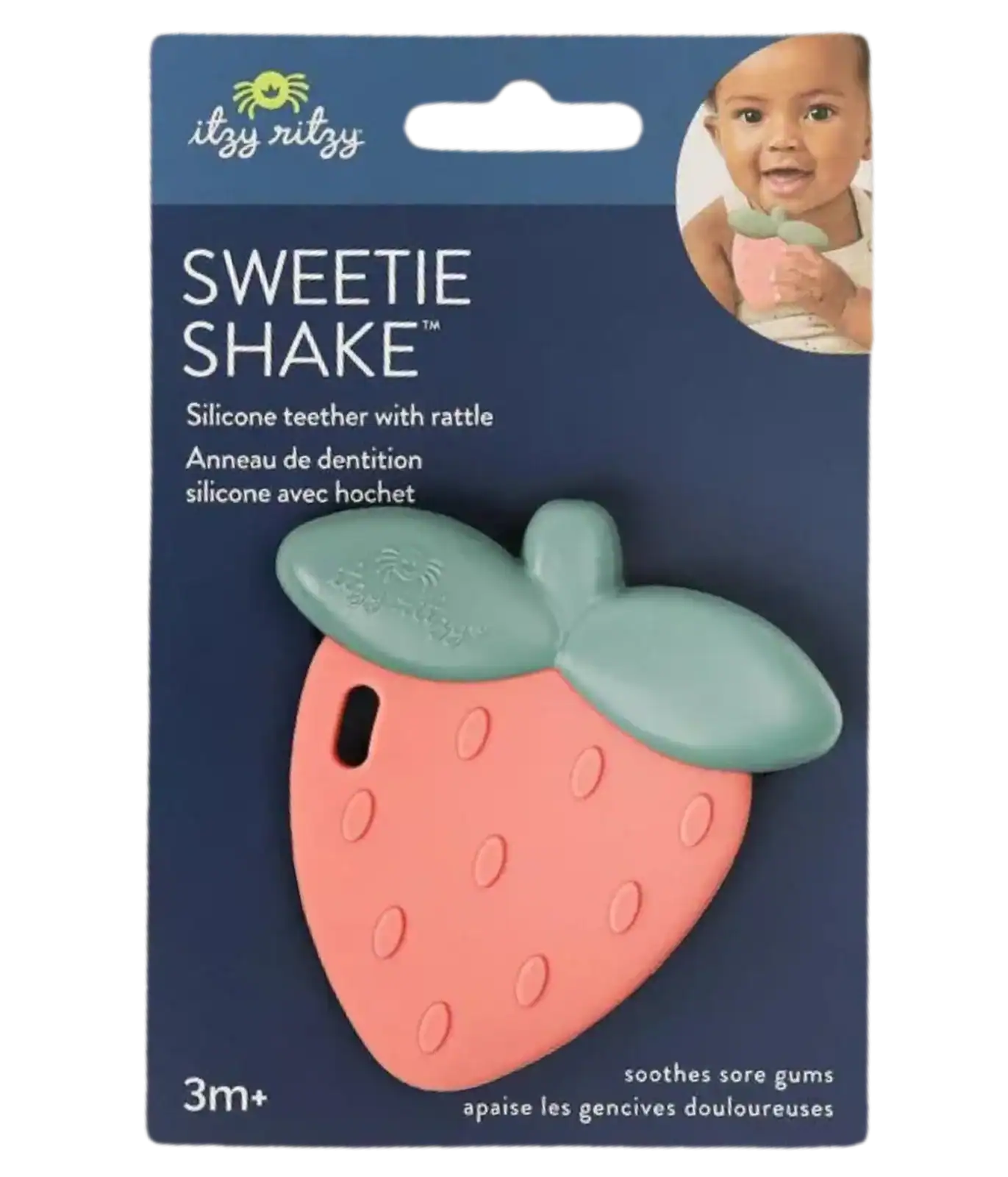Shake, Rattle & Teethe! Shake off those teething blues with the Sweetie Rattle™ silicone teether. Made of soft, flexible BPA-free silicone, this engaging rattle features multiple textures to soothe sore gums along with gentle rattle sounds to teach cause-and-effect.