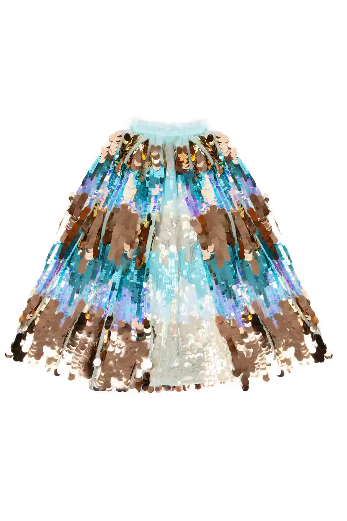 Make a splash in shimmering style with the 5th Avenue Paillette Cape, Mermalicious—where deep-sea dreams meet high-fashion flair! Designed for little ones who love to dazzle, this luxe cape features bold stripes of sequins that shimmer and shine with every step. Smaller sapphire-blue paillettes alternate with larger, luminous gold sequins, creating a scale-like texture that’s pure mermaid magic.