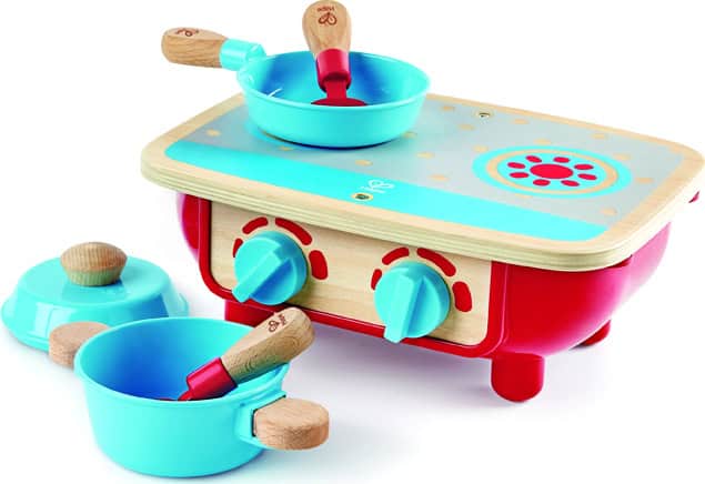 The Hape Wooden Cooking Set gives little chefs everything they need to whip up an imaginary feast. With a pot, pan, lid, spoon, and spatula, kids can cook just like the grown-ups. The stove knobs even click when turned, adding a realistic touch to every pretend recipe.