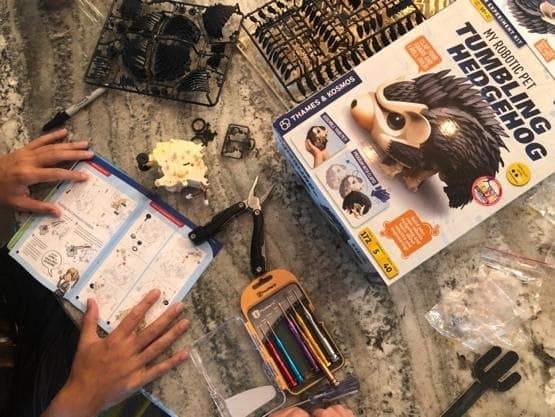 This Thames and Kosmos toy comes with a lot of tiny pieces that are assembled to create a clap-responsive tumbling robot that will wow you and your kids. The directions include detailed images and make the building process fun. While this toy is not meant for three-year-olds (and my husband did most of the building) my little guy watched intently, helped hand his dad tools and absorbed the process. For the 3-6 year-old age group, plan on being an adult robot builder with a little kid sidekick. For kids in the 7-10 year-old age group, they can be more hands on but might need some gentle prompting. Kids 10-years-old and up will enjoy working on this awesome robot on their own.